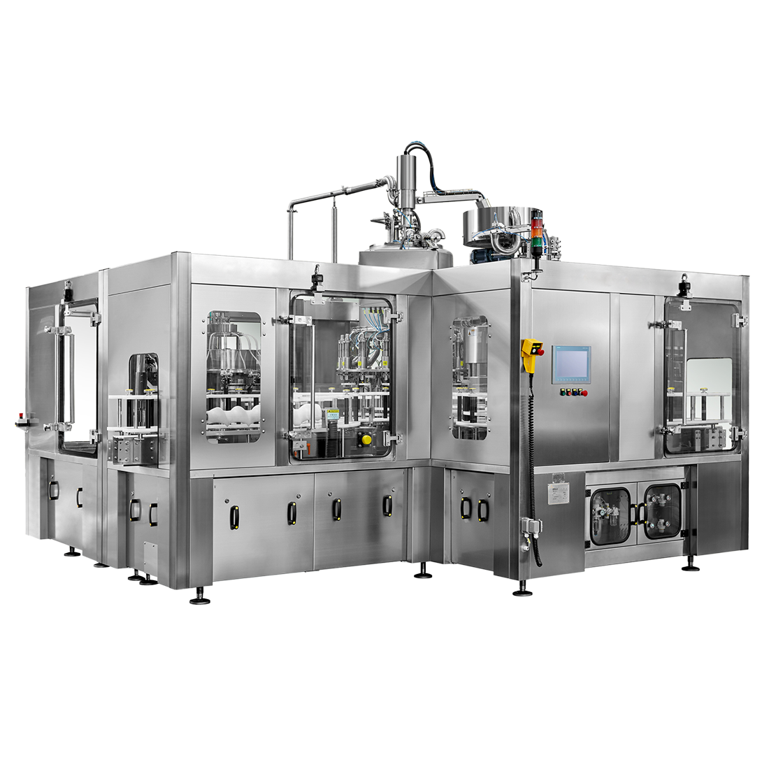 The rinsing part integrates both internal bottle rinsing and external bottle cleaning. The standard rinsing process includes rinsing with disinfectant, product water and dripping. Both mechanical & volumetric filling valves available for options. Capping turret completes with variable torque control, which is especially designed for big closures.